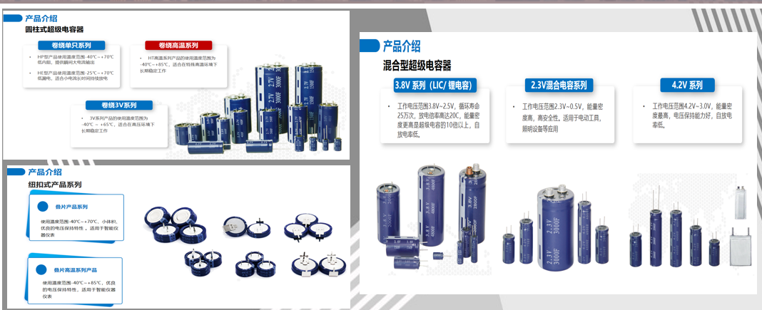 产品:混合式超级电容器,组合式超级电容器, 圆柱式超级电容器,纽扣式超级电容器