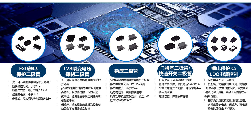 产品:ESD静电保护二极管, TVS瞬变电压抑制二极管,稳压二极管, 肖特基二极管/快速开关二极管,锂电保护IC/LDO电源控制