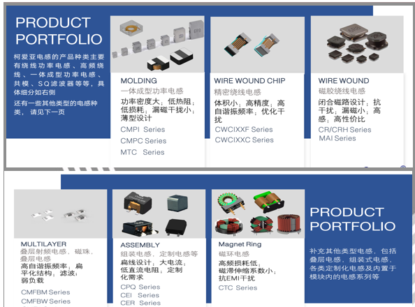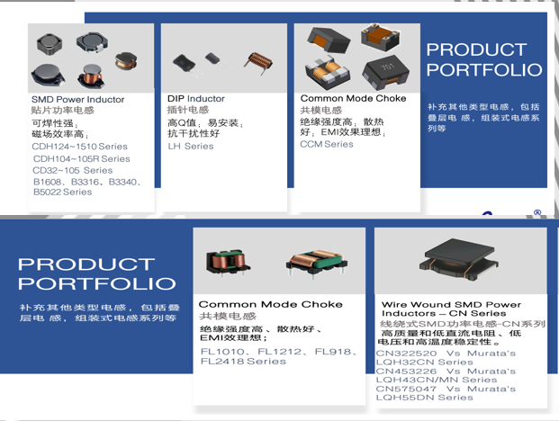 产品:功率电感,NR电感、Tcode一体成型电感,高频绕线电感, CCM共模电感.