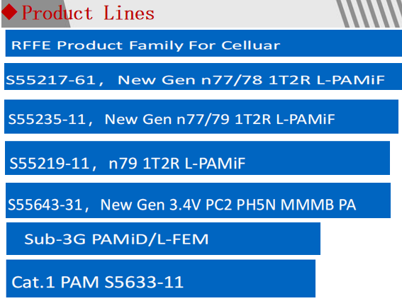 产品:Switch ,WiFi FEM, MMMB, LNA Bank, DiFEM, PAMiD, L-FEM,L-PAMiD, L-PAMiF, PAMiF