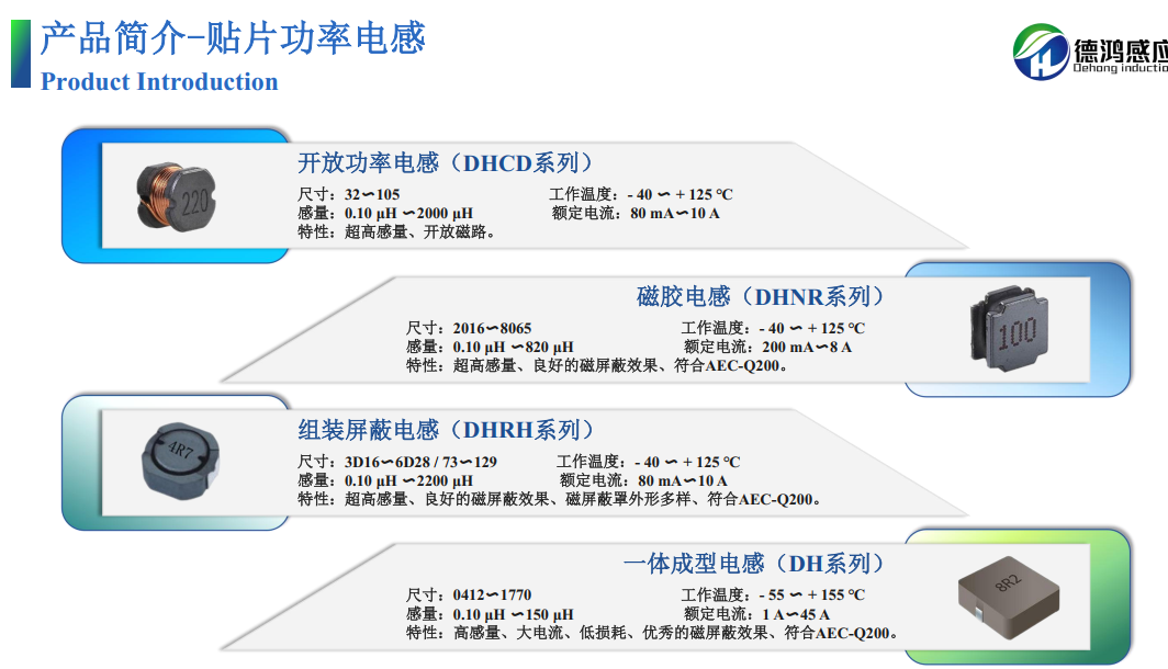 德鴻母公司成立於2004年, 产品品类覆盖T-Core模压电感、一体成型电感、组装屏蔽电感、磁胶电感、开放功率电感、叠层电感、共模电感、片式磁珠等。